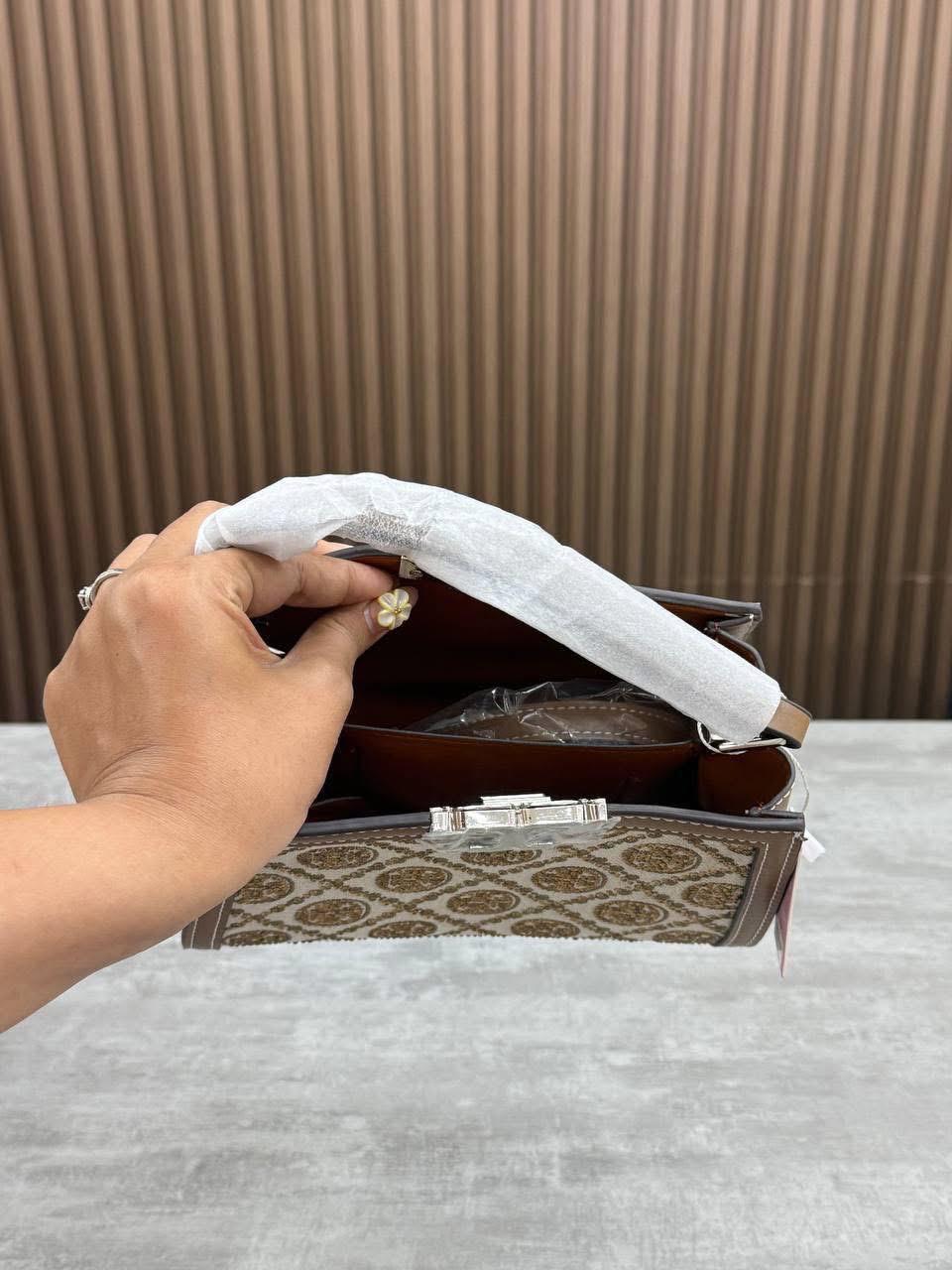 Design: Features a contemporary box-shape silhouette with a top handle and unique central latch/closure hardware.